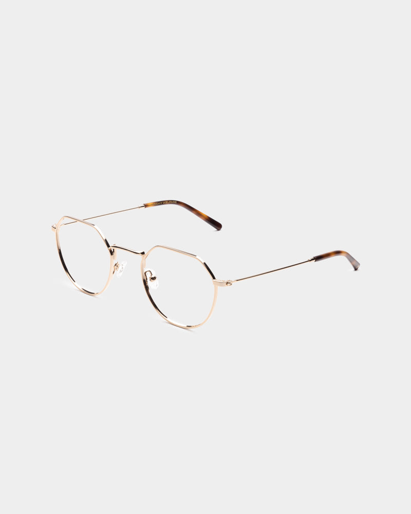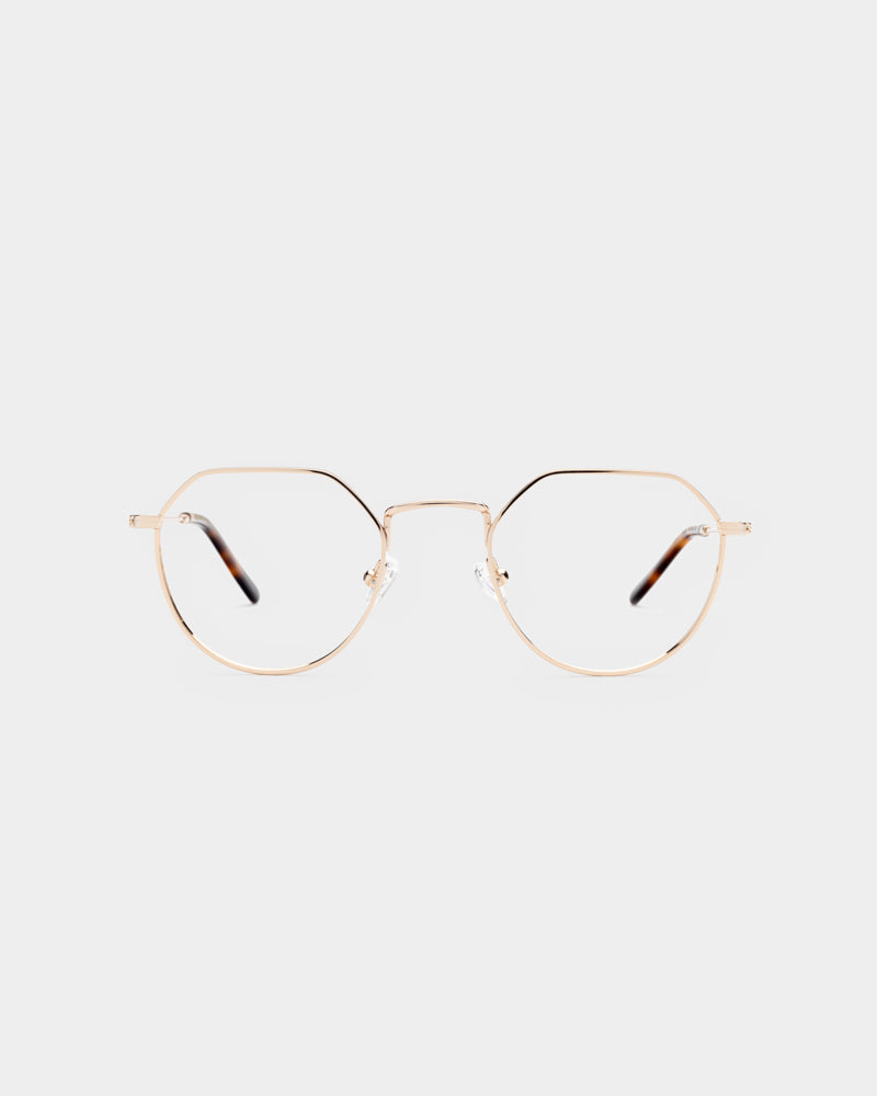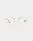 Gafa metálica con un tono dorado suave que le otorga elegancia y sofisticación.